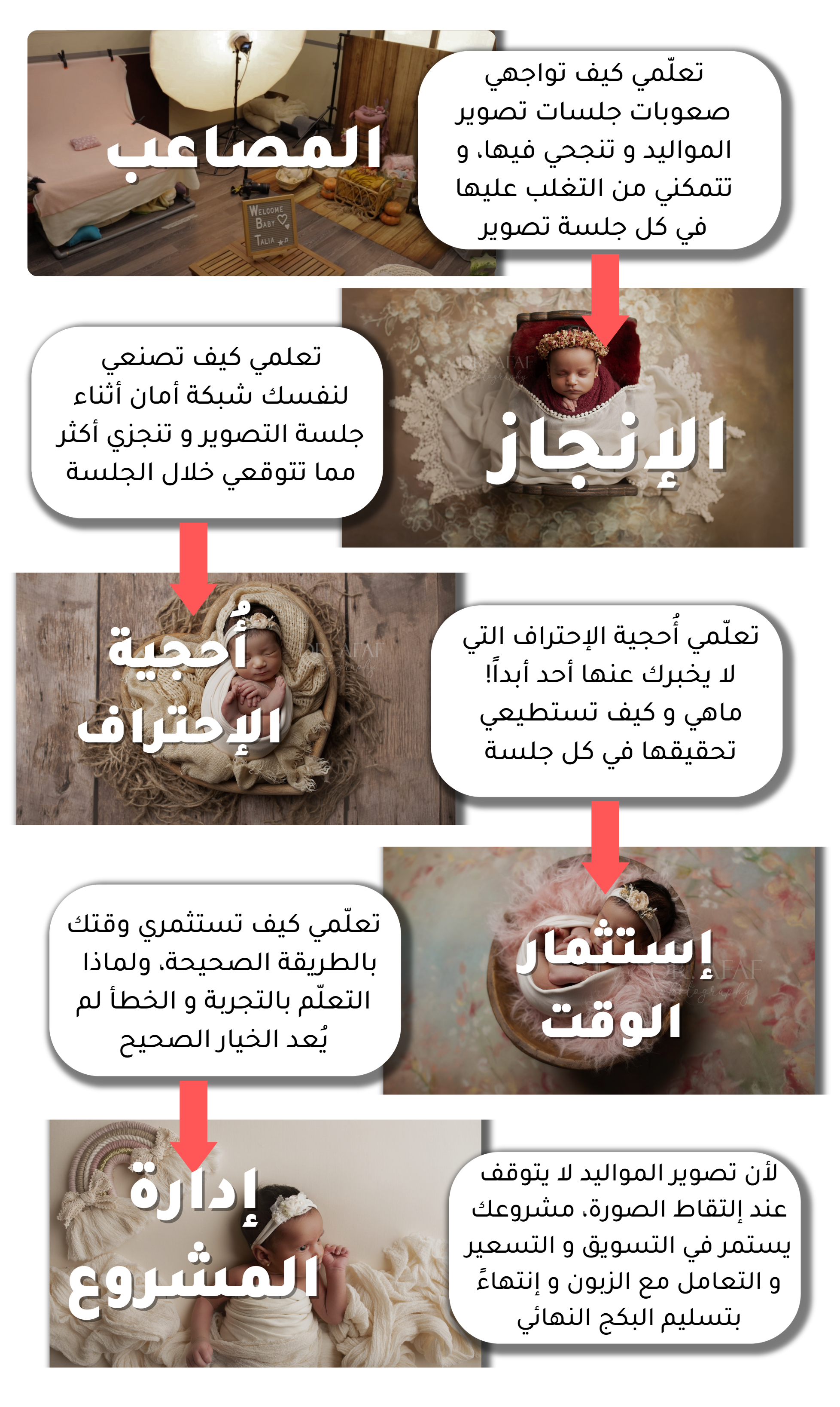 بعد تصوير أكثر من 100 مولود و بعد أن احترفت تصوير المواليد و حصدت أكثر من 10 ميداليات عالمية في تصوير المواليد ، قررت أن أساعد المصورات الأخريات و أنقل لهم شغفي في تصوير المواليد